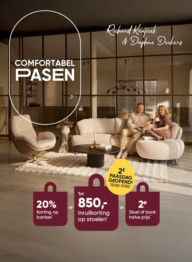 Bij Prominent winkel je zoals jij dat fijn vindt. Je kunt spontaan langskomen in een van onze ruim 40 winkels, een winkelafspraak maken met een van onze zitexperts, of onze collectie online bekijken. We komen ook graag naar je toe voor een thuisdemo. Zo kun je thuis in alle rust een mooie selectie zitmeubelen uitproberen en ontdekken wat het beste bij je past.
