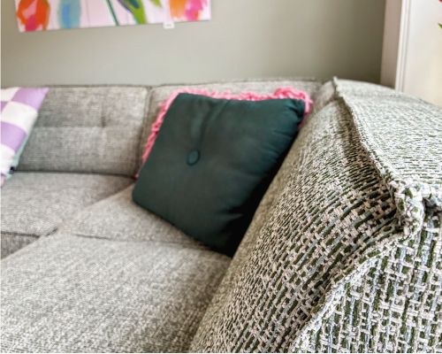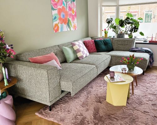 Centraal in de woonkamer staat de Bora bank in een diepe groentint, die prachtig aansluit bij de pastelkleuren en natuurlijke materialen in huis. De bank brengt rust en balans, en vormt tegelijkertijd de plek waar alles samenkomt, van ontspannen momenten tot gezellige avonden.